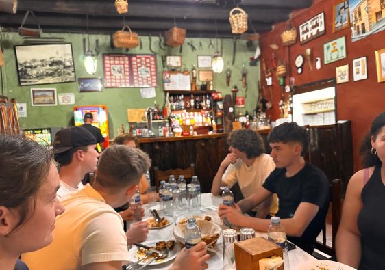 The school itself has a beautiful architechture and even offers a soccer place as well as a basketball court to their local students during the breaks. We were guided through the school by one voluntary student who also answered our questions e.g. about the grading system in Spain, ranging from 0-10 while 5 is the minimum requirement to pass exams. The students were all very welcoming and we felt like celebrities respectively the main attractions during our stay. Unlike our German school, the IES is also very strict when it comes to using a mobile device during class. Furthermore teachers only teach one subject instead of the regular two in Germany, developing them into experts for their respective subject. Surprisingly, most subjects the Spanish students study are similar to the ones at NPG with even German being a learnable language at IES Villalba Hervás, although philosophy or economy are exceptions to this norm. Another major difference is the fact that Spanish people call their teachers by their first name. Whenever a break begins or ends, there is no ringing bell but instead it plays music which motivates a lot of students. Overall, all of us were very impressed by our Spanish partner school!
